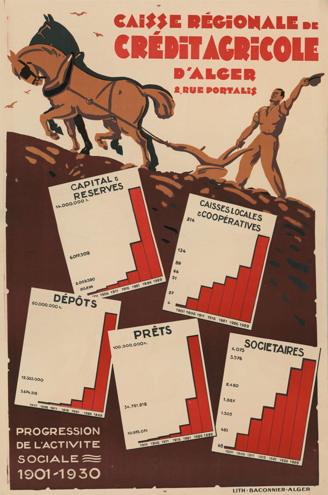 Affiche de la Caisse régionale d'Alger (années 1930, collection des archives historiques de Crédit Agricole SA).