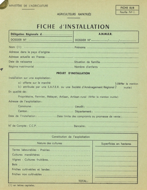 Questionnaire pour les agriculteurs rapatriés d'Algérie (fonds archives historiques de Crédit Agricole SA).
