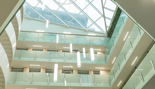 A l’intérieur le bâtiment a été pensé autour d’un Atrium sous une verrière, composante majeure du projet. Lieu d’échanges et de rencontres, cet Atrium est animé par un jeu de matériaux : revêtement de sol minéral, escalier magistral, coursives distribuant les bureaux, habillage en bois régional, mur végétal…