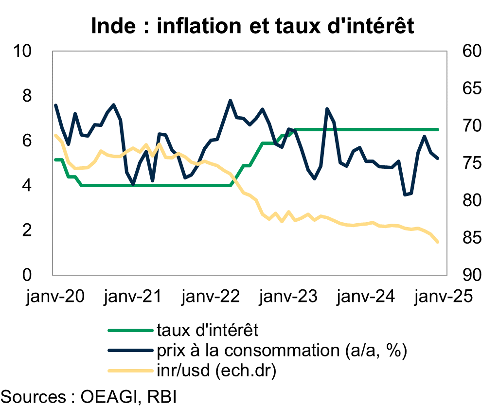Alors que la banque centrale indienne (RBI) a pour l’instant maintenu inchangé son taux directeur, à 6,5%, une première baisse pourrait être décidée lors du prochain comité monétaire de février. Quitte à sacrifier la roupie en utilisant les réserves de change accumulées pour la défendre si nécessaire, comme cela a déjà été fait ces derniers mois – les réserves sont d’ailleurs passées de 616 milliards de dollars en septembre à 534 milliards en janvier. Il est donc probable de voir le cours de la devise indienne passer sous les 90 inr/usd dans les prochains mois, ce qui représenterait une dépréciation d’environ 30% par rapport au niveau d’avant la pandémie.