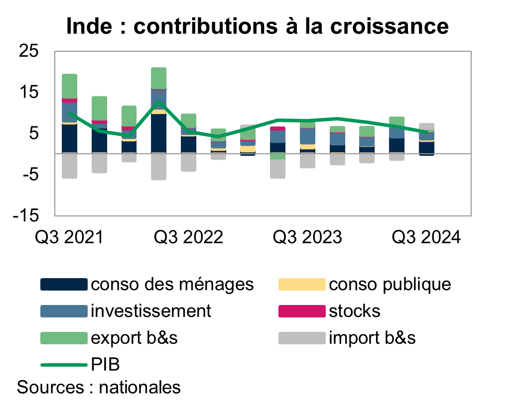 La baisse de la consommation, en biens durables notamment (automobile, deux roues et équipements de la maison), pèse directement sur les grands groupes indiens. Encore peu compétitifs à l’exportation, dans un pays qui demeure très protectionniste et qui n’a pas signé beaucoup d’accords de libre-échange, ces derniers comptent avant tout sur le vaste marché intérieur pour absorber leur production. La contribution des importations nettes à la croissance est redevenue positive, signalant un net ralentissement des importations alors même que les prix ont nettement augmenté en raison de la faiblesse de la roupie. Tous ces éléments sont le reflet d’une demande interne en berne.