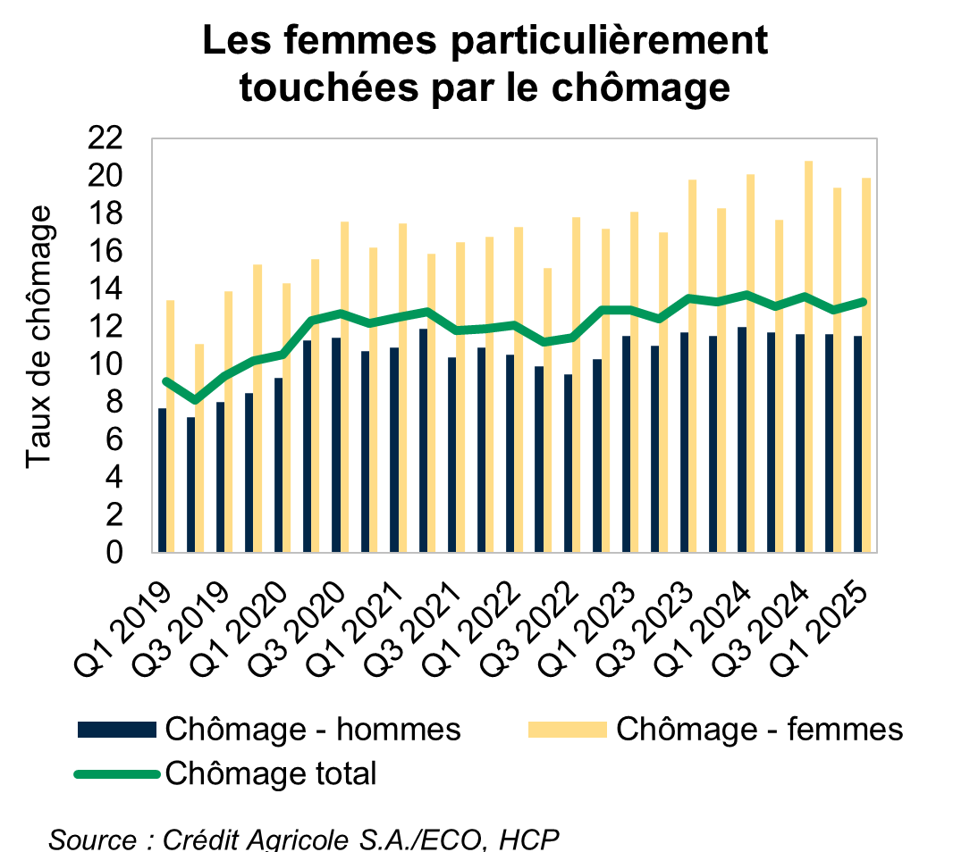 Au Maroc, quelque chose bouge. C’est indéniable lorsqu’on regarde les tendances économiques récentes. Malgré un attachement à la stabilité, qui, longtemps, a semblé s’opposer au dynamisme de l’économie, le pays s’est lancé dans un programme de réformes qui semble commencer à porter ses fruits. Le pays attire les investissements, se tourne vers l’export. Il y a de quoi être optimiste sur les perspectives de croissance, d’autant que les autorités convainquent dans leur gestion des chocs. Pourtant, un indicateur suit une route à contre-courant : le chômage. À 13,3% en 2024, il atteint des niveaux record et sa trajectoire inquiète. Dans son dernier rapport de suivi de l’économie marocaine, la Banque mondiale souligne que l’évolution de la population active surpasse largement le rythme de création d’emplois. Et si les chocs, récurrents et violents, des dernières années exercent des pressions supplémentaires, ils ne sont que des accélérateurs d’un problème structurel de fond. Or, si le Maroc a entrepris des réformes, il reste une réponse efficace pour accélérer, à plus court terme, la croissance et réduire le chômage : s’attaquer aux contraintes structurelles au travail des femmes. Celles-ci ont un taux de participation parmi les plus faibles au monde et le niveau de chômage des femmes dépasse largement celui des hommes. En cause, notamment, les normes sociales de genre. Et c’est ainsi que les causes féministes sont rejointes, de plus en plus, par la nécessité économique. Le Maroc, s’il regarde ailleurs, pourrait trouver un exemple des plus frappants : en Arabie saoudite, société bien plus conservatrice, ce sont les quotas en faveur des femmes qui ont le plus contribué à la réduction du chômage ces dernières années.