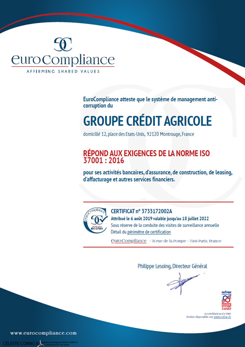 This commitment enabled the Crédit Agricole Group to become the first French bank to obtain ISO 37001 certification for its system, recognising its commitment and the quality of its prevention program by not accepting any form of corruption or influence peddling. This certification is renewed every three years.