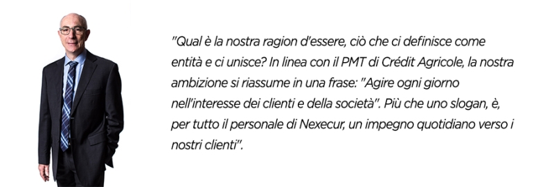In linea con il Progetto di Gruppo Crédit Agricole e i suoi obiettivi, Nexecur nutre l'ambizione di diventare l'operatore di riferimento nel proprio settore di specializzazione. Per soddisfare questa ambizione, fa leva su offerte adeguate alle nuove forme di consumo e ai momenti della vita dei clienti, sempre privilegiando l'eccellenza relazionale.