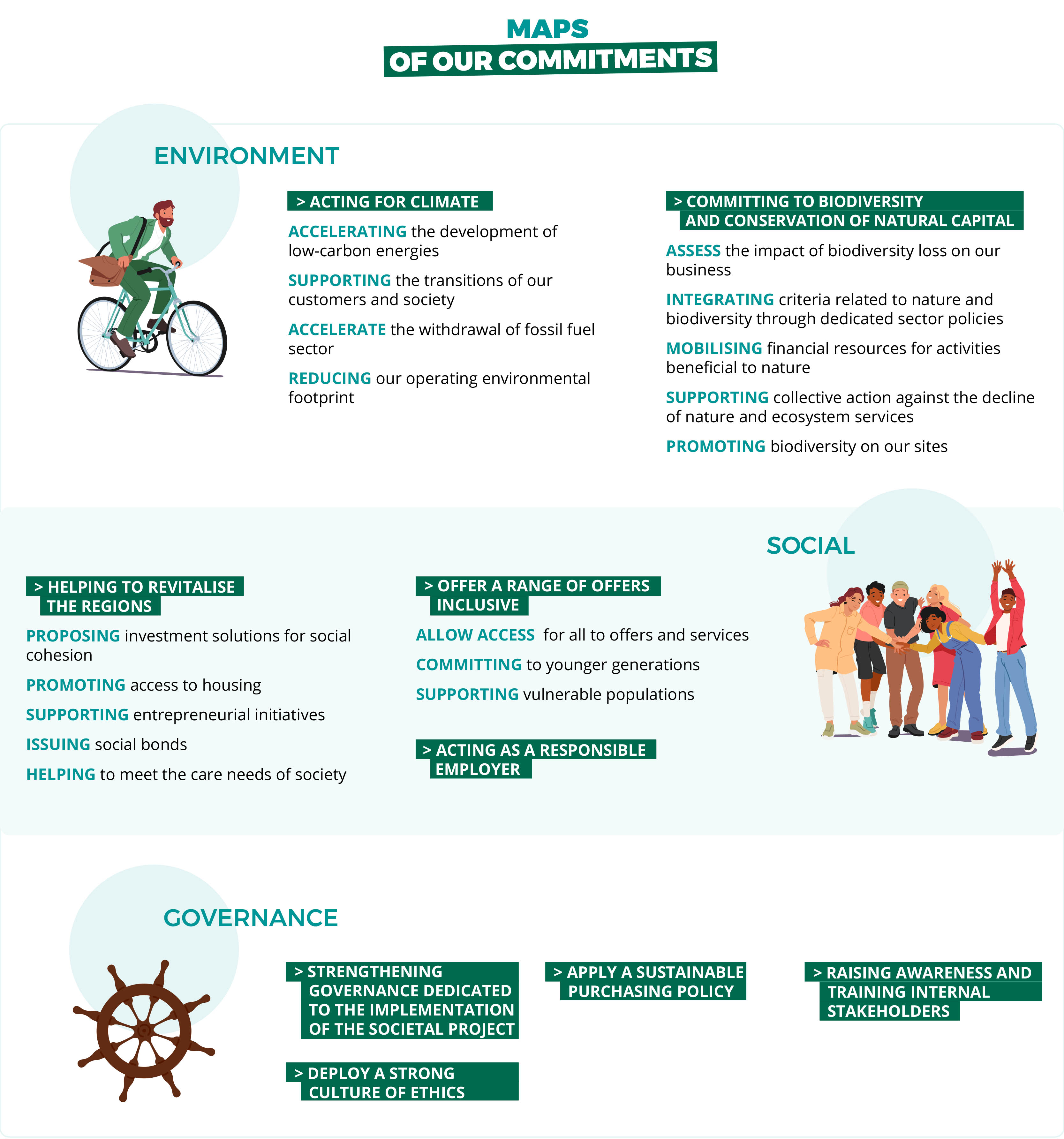 Crédit Agricole implements its Societal Project through a CSR strategy that is integrated into its business model. With governance of environmental and social impacts at the highest level and the integration of ESG criteria into processes, it is transforming all the group's business lines. The Group's CSR strategy is fully in line with the 17 Sustainable Development Goals (SDGs).