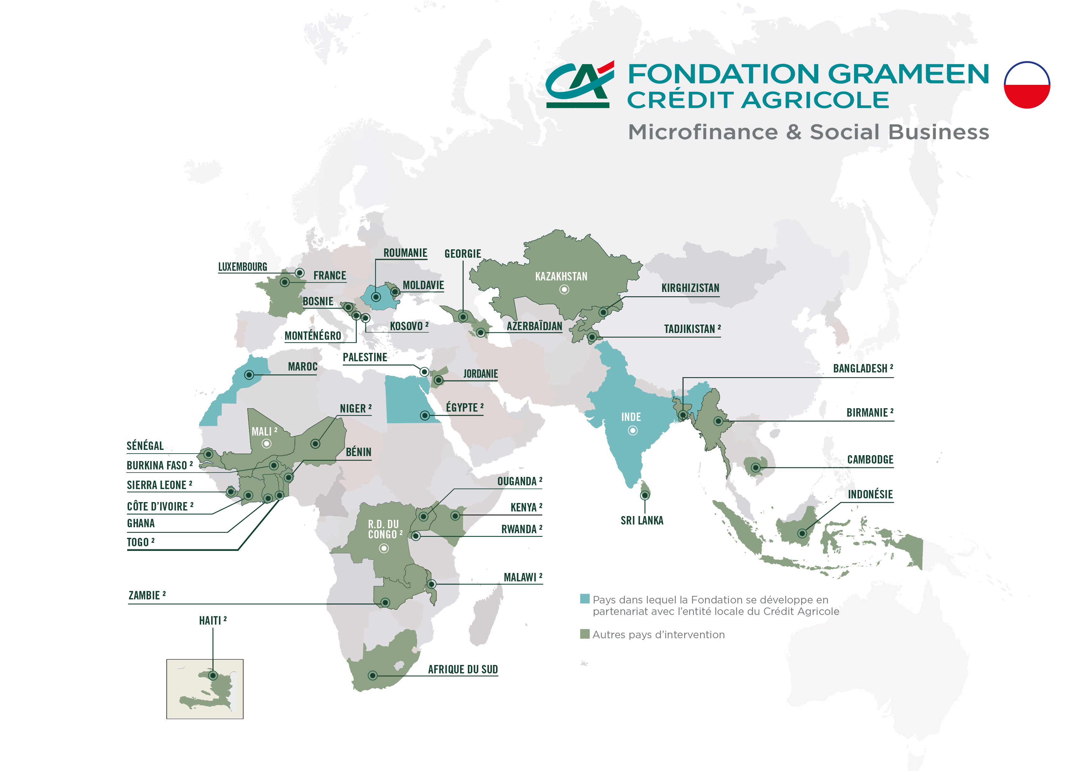 Créée en 2008 sous l'impulsion conjointe des dirigeants de Crédit Agricole S.A. et du Professeur Yunus, Prix Nobel de la Paix 2006 et fondateur de la Grameen Bank, la Fondation Grameen Crédit Agricole SA est un opérateur multi-métiers qui contribue à la lutte contre la pauvreté et les inégalités en promouvant l'inclusion financière et l'entrepreneuriat à impact social. Investisseur, prêteur, coordinateur d'assistance technique et conseiller de Fonds, la Fondation finance et accompagne les institutions de microfinance, les entreprises et les projets qui promeuvent une finance inclusive et le développement des économies rurales partout dans le monde.