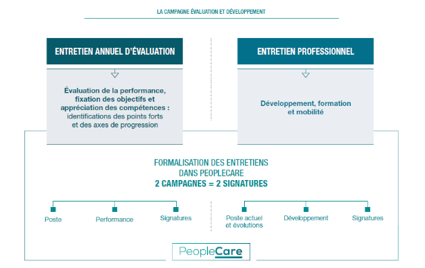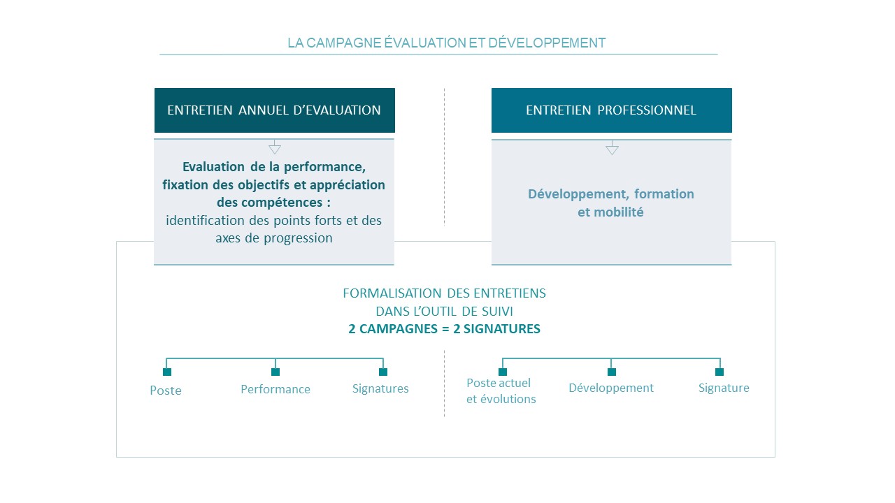 A cet effet, la campagne Évaluation & Développement est structurée autour de deux entretiens annuels : l’entretien d’évaluation et l’entretien professionnel. Ces deux entretiens sont formalisés dans un outil de suivi et de gestion de carrière.